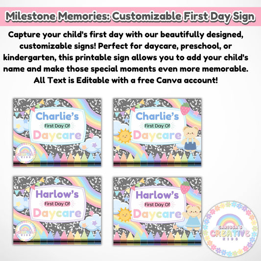 Editable First Day of Daycare Sign Template, Personalized Back to School Photo Prop, Printable First Day of School, Instant Download Forms