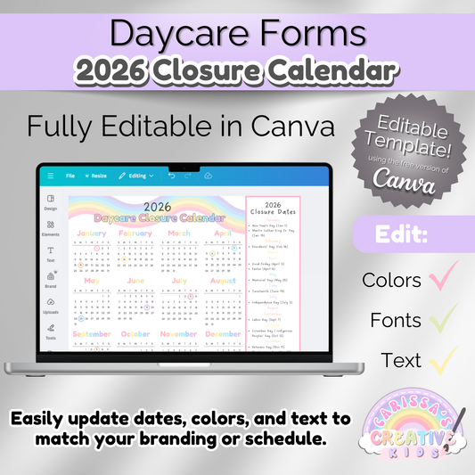 Editable 2026 Daycare & Preschool Closure Calendar – Printable Canva Template (One Page)