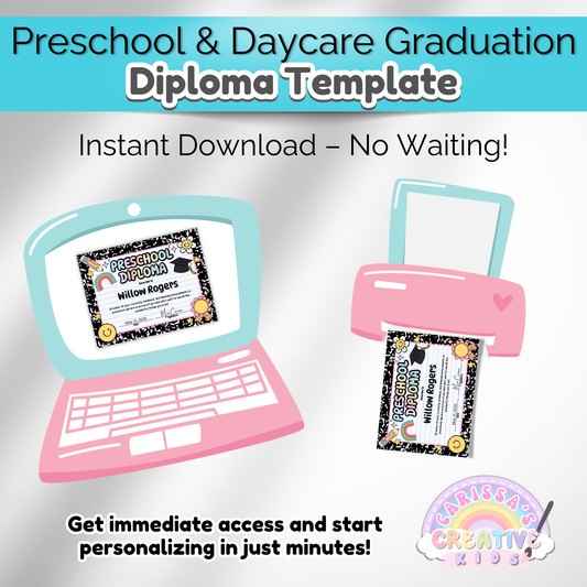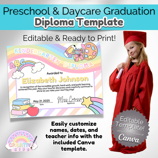 Perfect for daycare providers, preschool teachers, and kindergarten classrooms, these diplomas double as keepsakes for families while adding a professional touch to your graduation ceremony. Simply edit in Canva, print, and present!