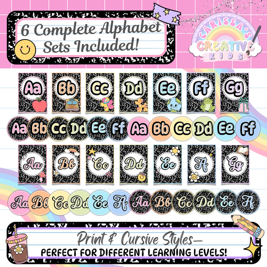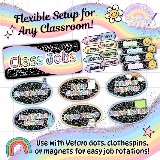 Meet the Retro Rainbow Collection — a bold and playful twist on classic school-day vibes. This groovy retro classroom theme blends pastel rainbows with high-contrast black-and-white composition notebook textures, lined paper accents, and cute school supply graphics to give your space a totally unique look.