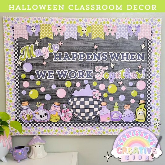 Printable Pastel Halloween Bulletin Board Kit – Cute Fall Classroom Decor with Cauldron, Bows, and Potion Bottles