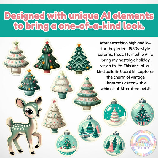 Vintage Christmas Bulletin Board Kit Retro Inspired Classroom Decor Digital Download Featuring Unique AI 50s Ceramic Christmas Trees & Deer