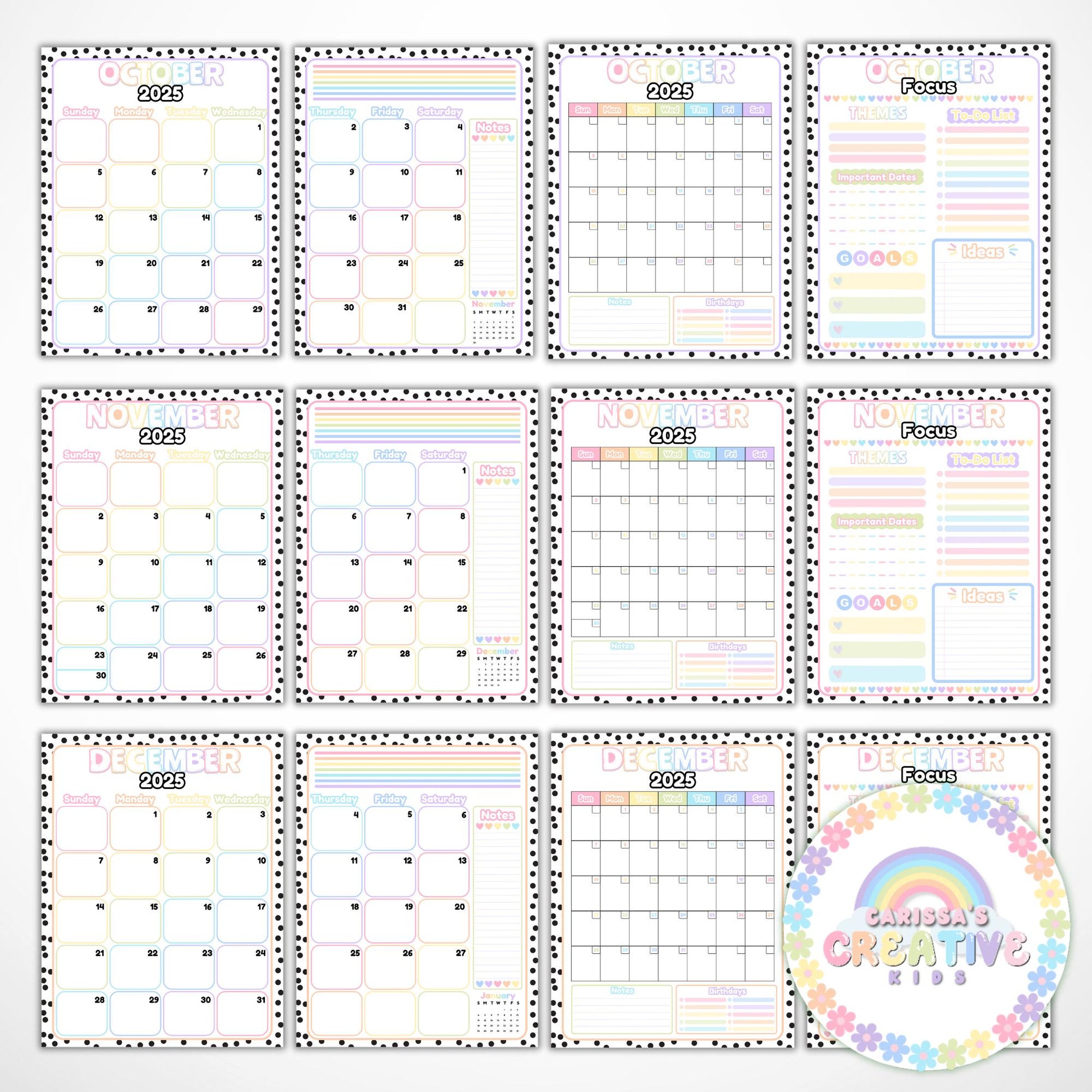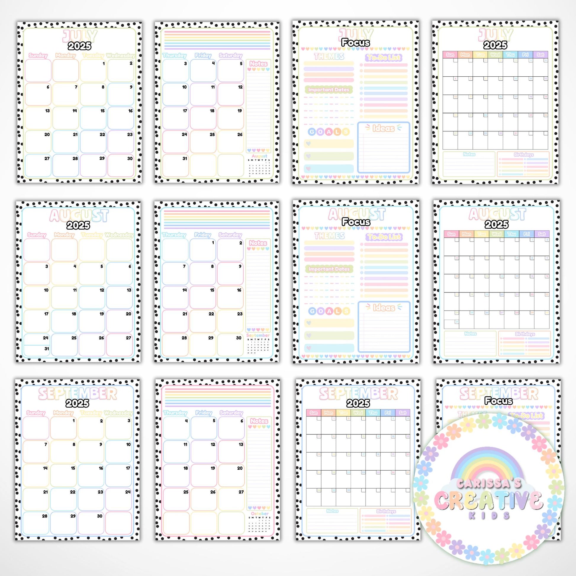 Bring style and organization to your classroom, home, or daycare with this adorable 2025 Printable Pastel Calendar! Designed with teachers, daycare providers, and homeschool educators in mind, this planner is both functional and aesthetically pleasing. Featuring soft pastel colors against a chic black-dotted background, it’s the perfect blend of fun and professionalism. With both U.S. Letter and A4 sizes included, this calendar set offers flexibility for printing at home or at your preferred print shop.