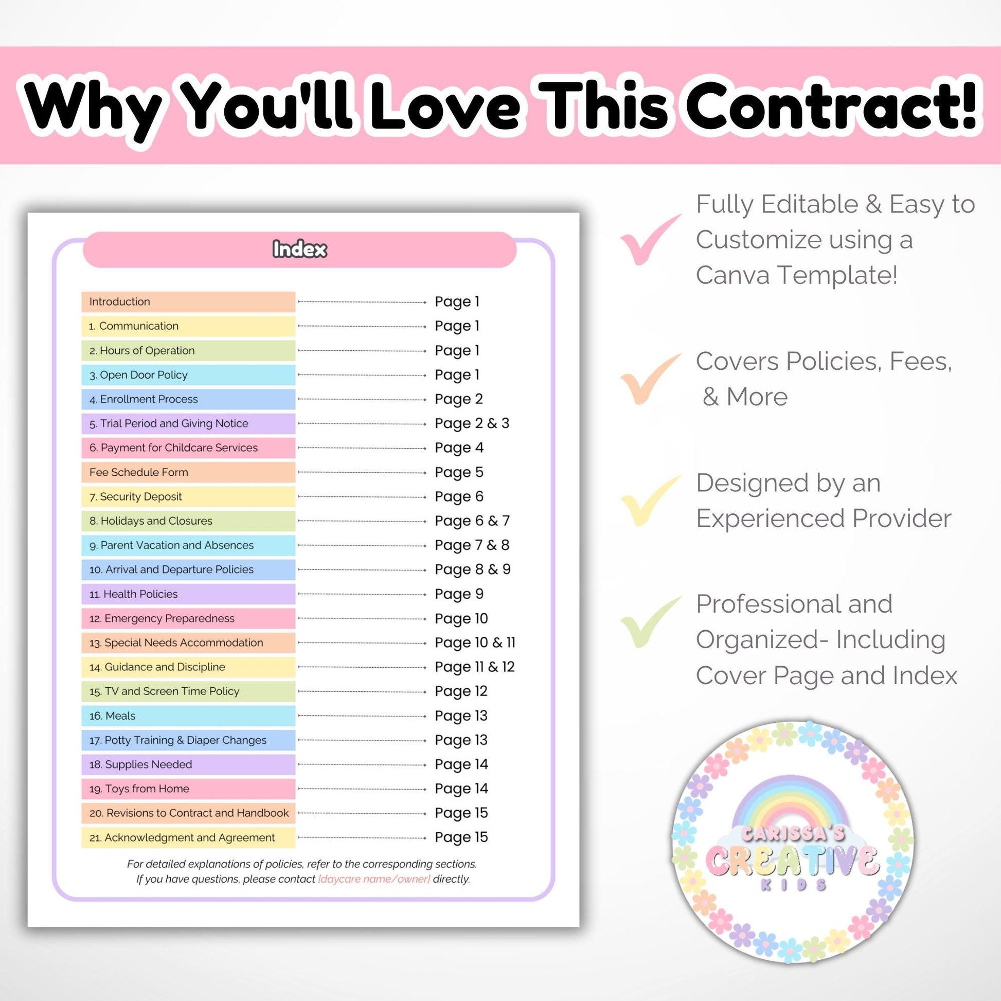 A 17-page comprehensive childcare contract colorful and professionally designed.
