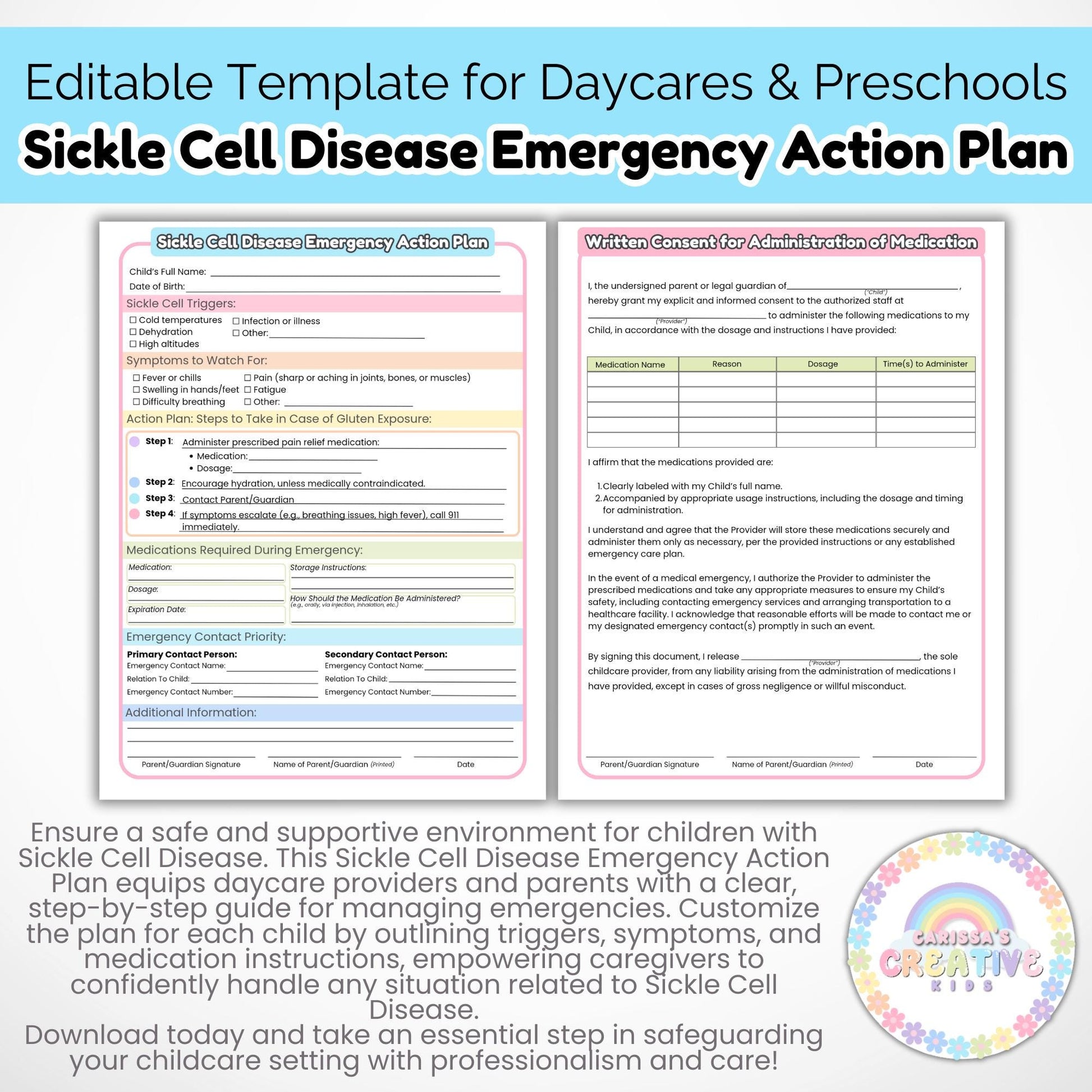 Daycare Forms- Sickle Cell Disease Emergency Action Plan Editable Template