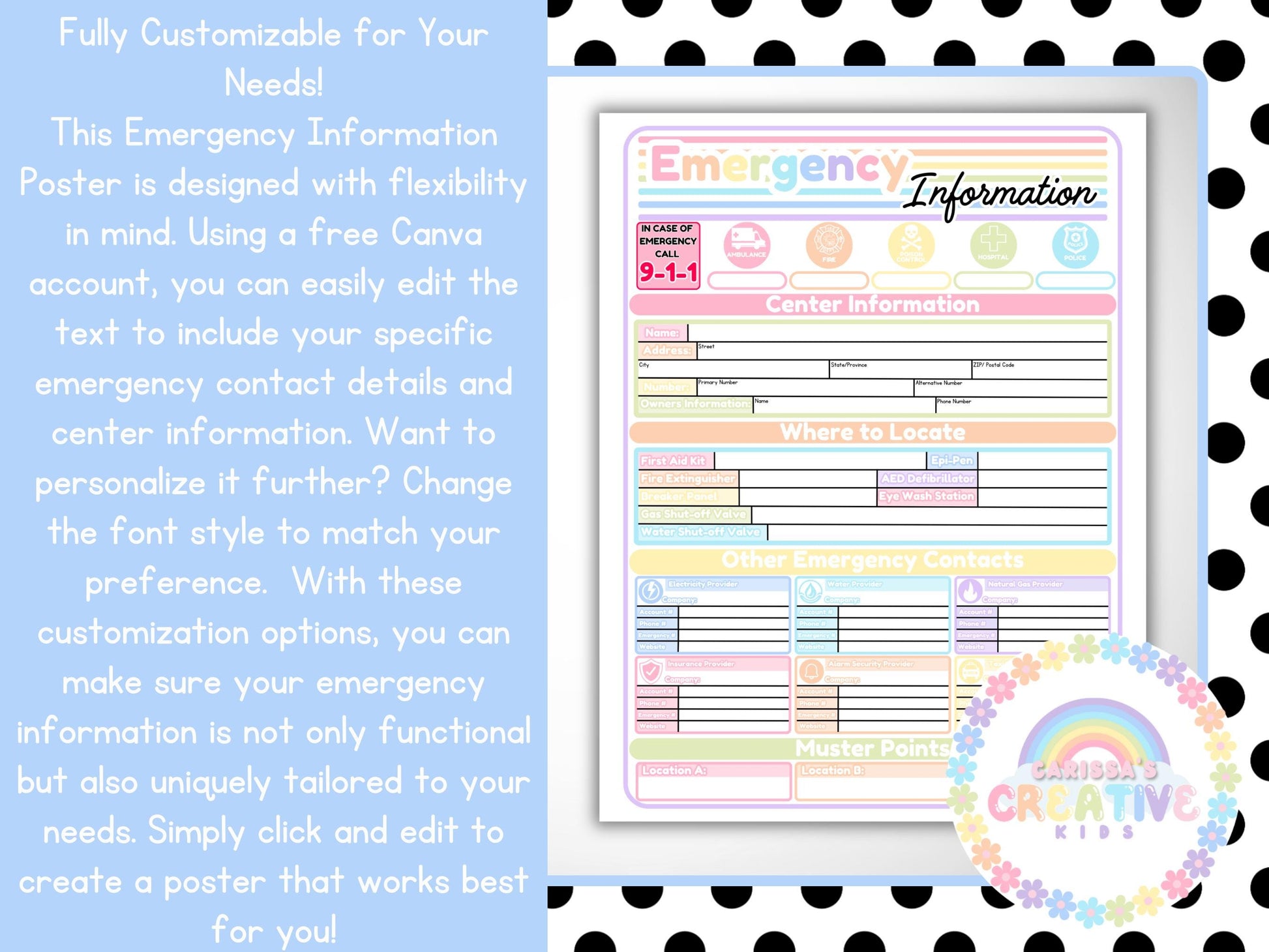 Fully Customizable: Using Canva, you can edit text, change fonts, and adjust font colors to fit your unique needs. Personalize every detail to match your specific emergency contacts and safety information.