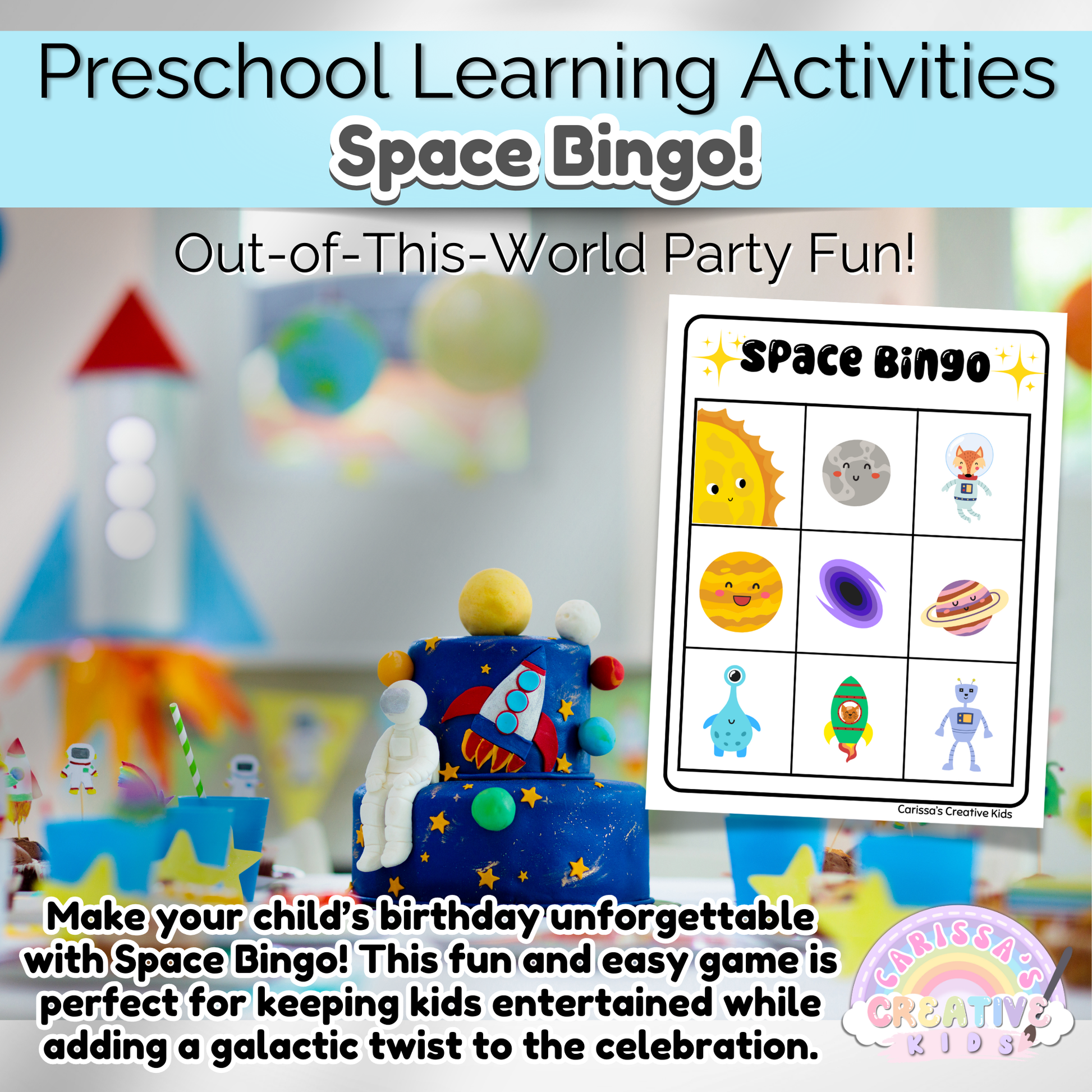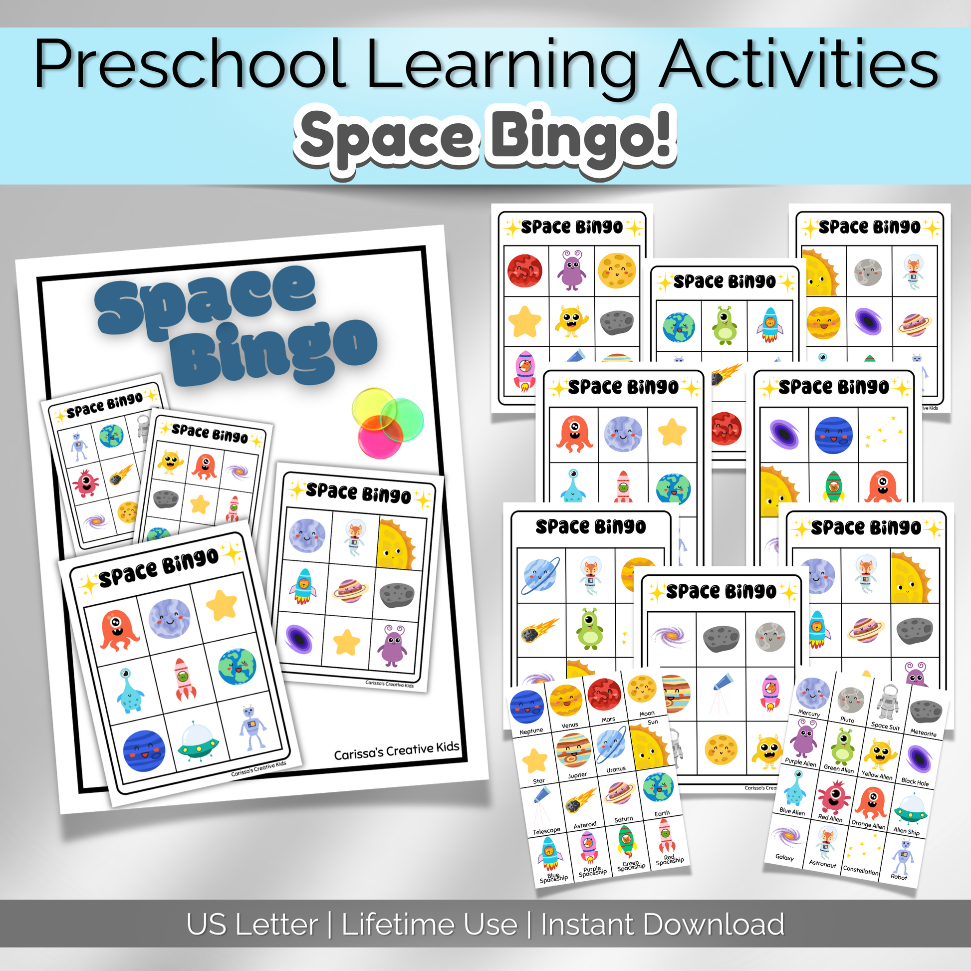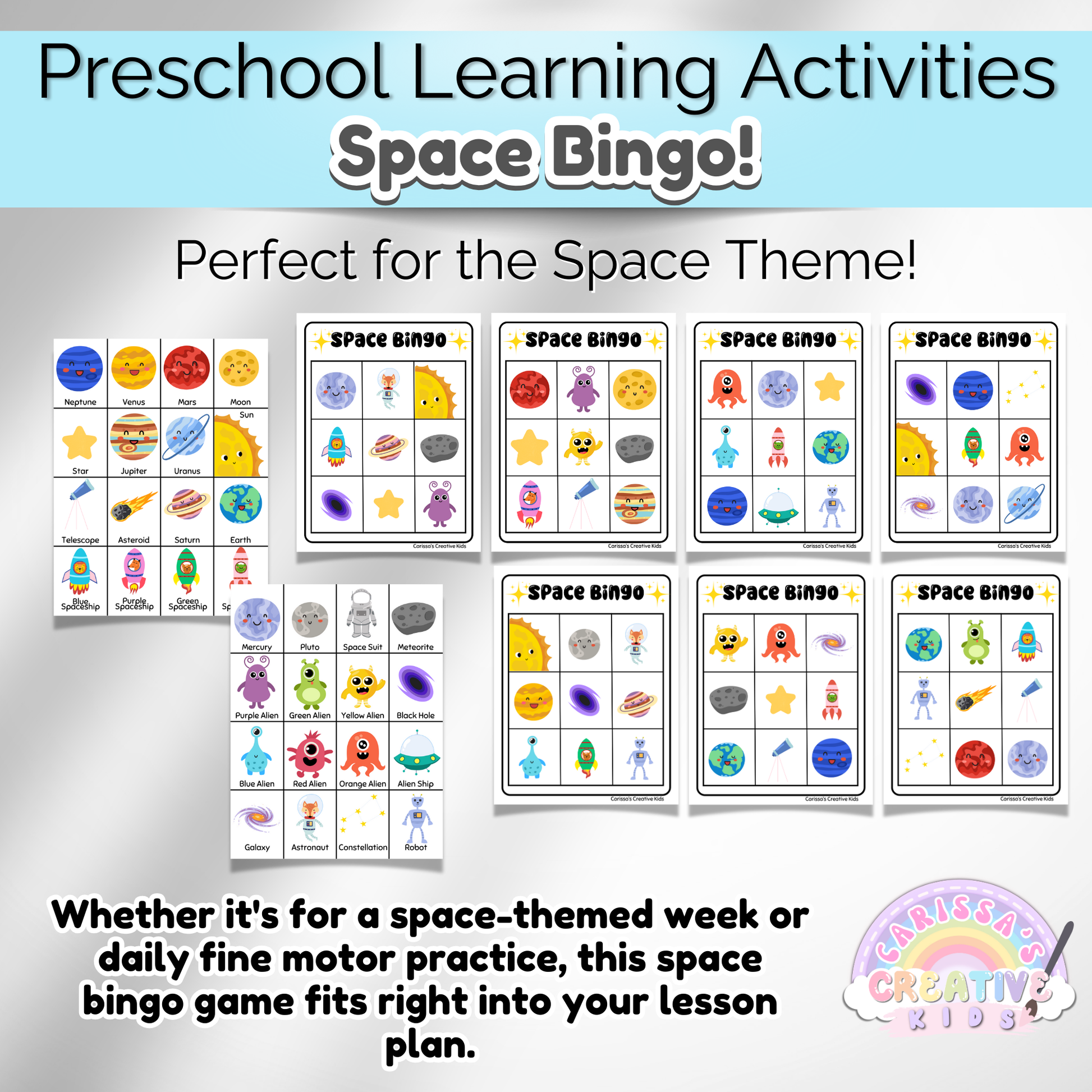 Check out my shop to find this bingo game PLUS 24 other space-themed activities in the Creative Kids Outer Space Math & Literacy Curriculum Pack! Perfect for enriching any preschool or daycare curriculum.